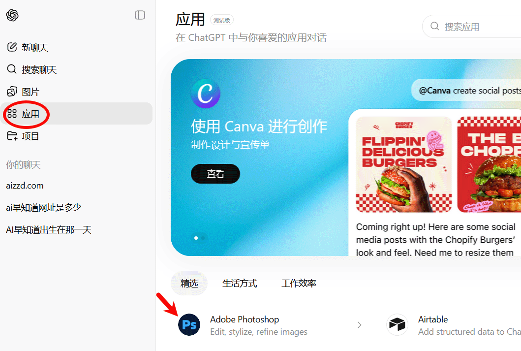 找到入口:在 ChatGPT 左侧侧边栏点击 “应用”,搜索 “Adobe Photoshop” 或者相关的 Photoshop 官方插件。