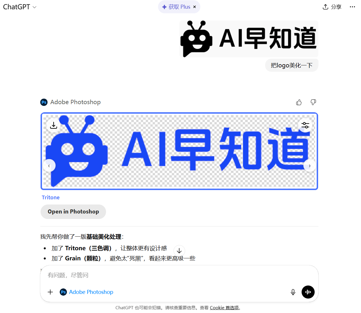 AI早知道 玩了这么多年的修图,从来没想过 ChatGPT 能和 Adobe Photoshop 这种“硬核选手”直接合体。以前改个图要抠半天图层,现在倒好,你把图往对话框一扔,动动嘴皮子,剩下的活儿 AI 全给你包圆了!